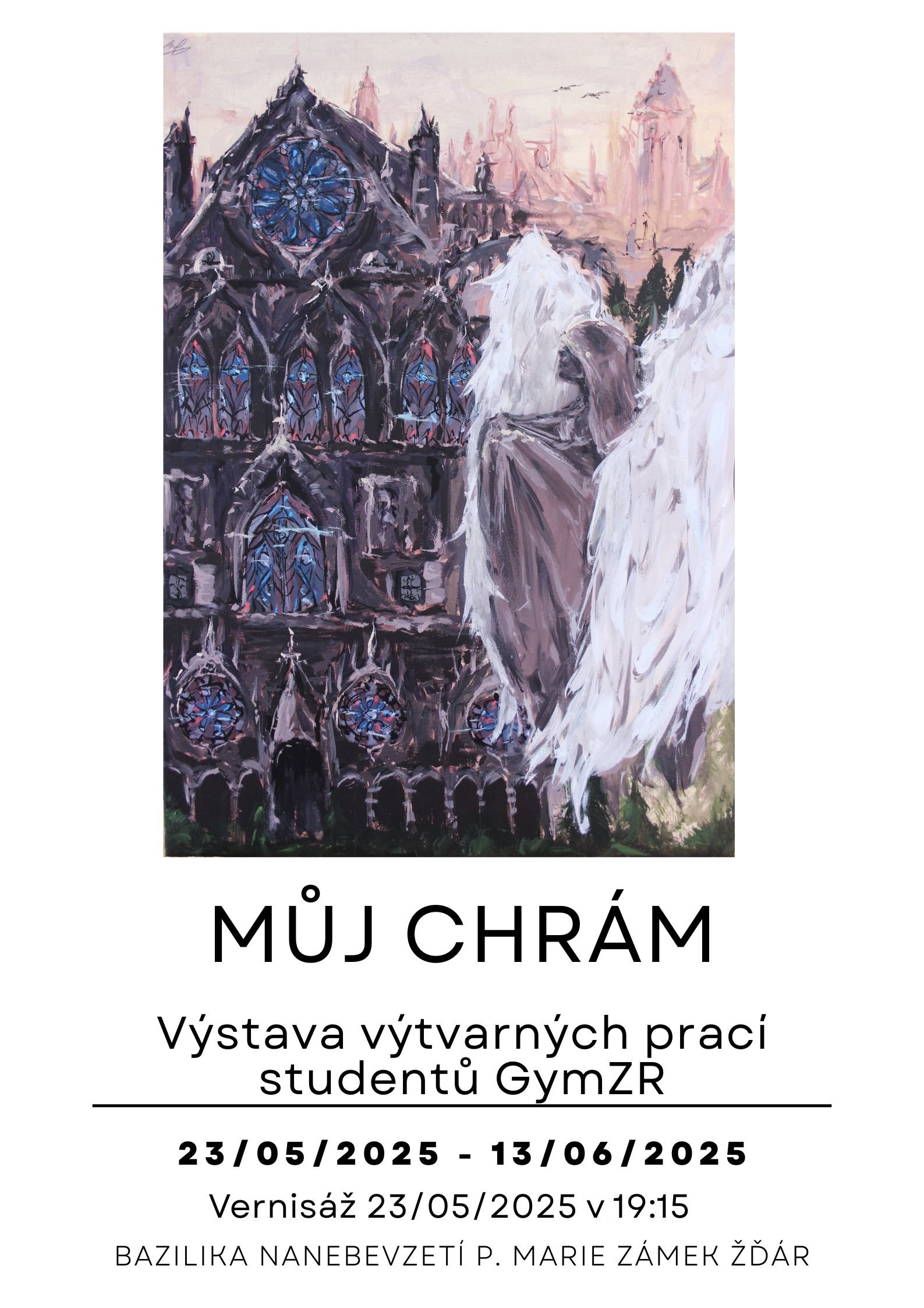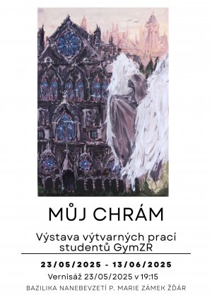 V pátek 23. 5. 2025 se od 19:15 uskuteční v rámci programu Noci kostelů vernisáž výstavy výtvarných děl studentů našeho gymnázia s názvem Můj chrám v bazilice Nanebevzetí Panny Marie a svatého Mikuláše v zámku Žďáře. Výstavu bude možné zhlédnout do 13. 6. 2025.